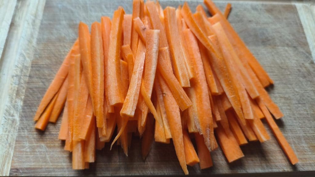 Para preparar os rolinhos primavera, comece pelos vegetais: lave e corte em tiras finas as cenouras, o repolho e as cebolas.