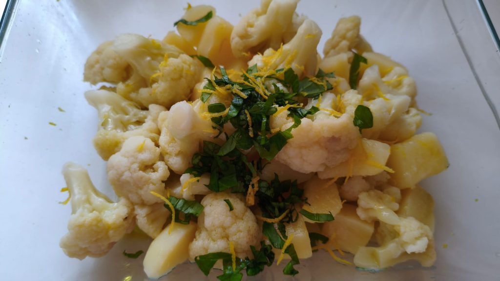A coisa boa é que são necessários pouquíssimos ingredientes: couve-flor, batatas, um limão bem perfumado e um fio de azeite de oliva bom. Cozinham-se os vegetais, deixam-se esfriar e tempera-se tudo com suco de limão fresco, raspas raladas, sal e um toque de manjericão ou salsa picada. Desta vez, adicionei também algumas azeitonas.