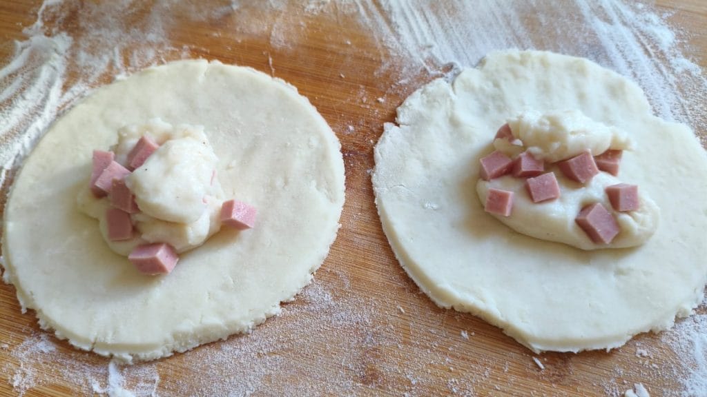 Recheie com molho branco e cubos de presunto e feche a massa sobre si mesma formando uma meia-lua.