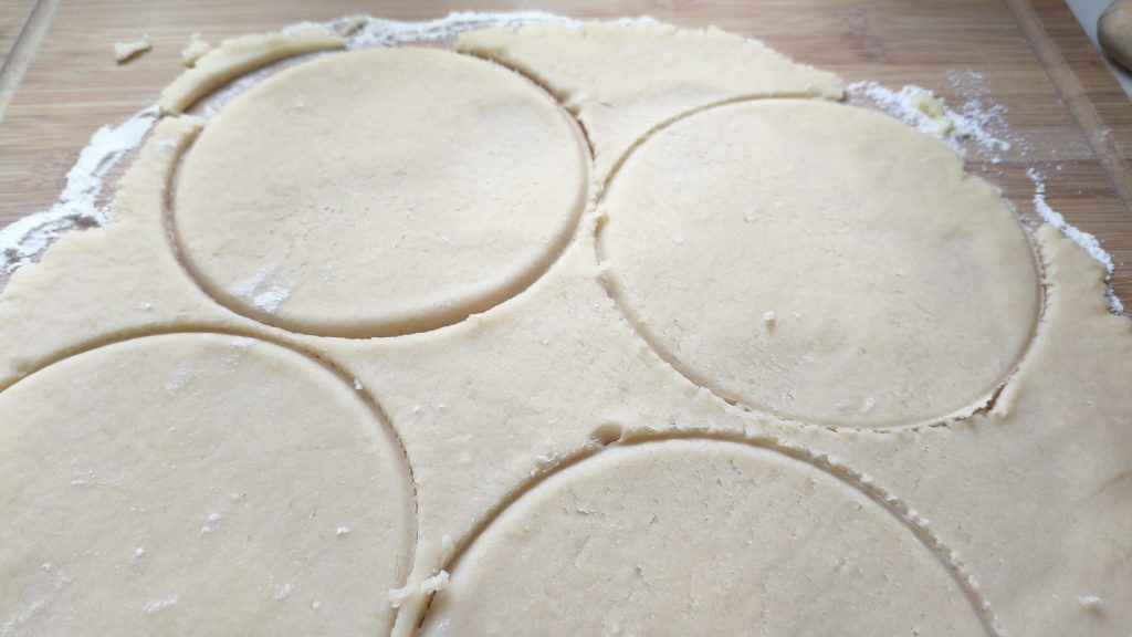 Abra a massa até cerca de 3 mm e corte discos (diâmetro 10–12 cm).