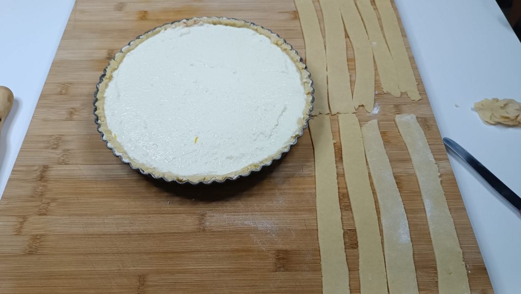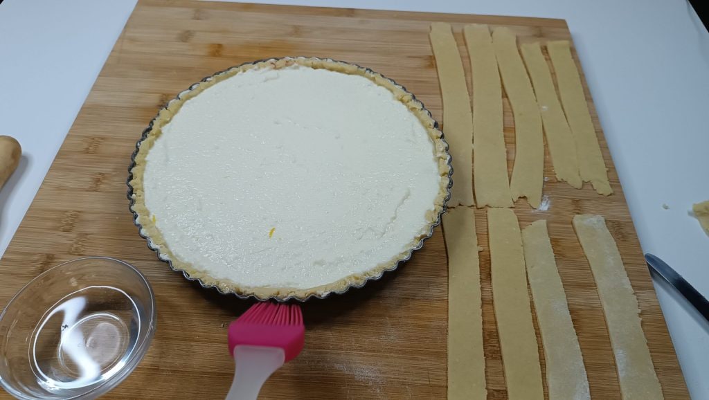 • Molhe as bordas da torta para fixar bem as tiras de massa
