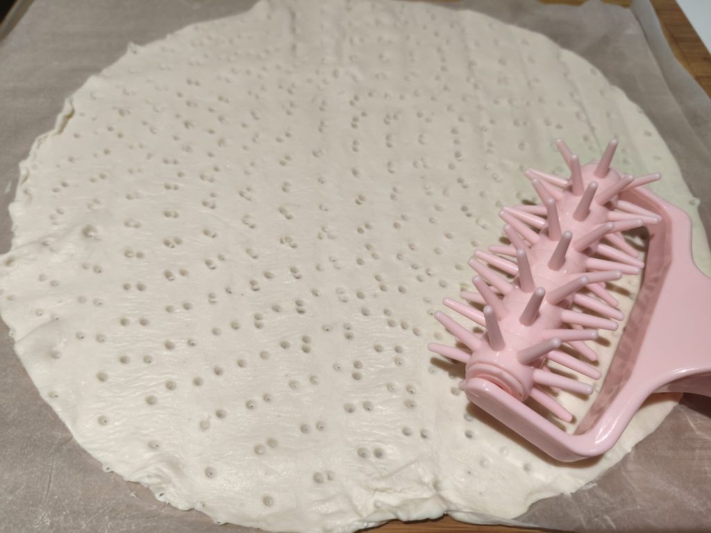 Desenrole o primeiro disco de massa folhada e fure a superfície com um furador de massa ou um garfo para evitar que inche muito durante o cozimento.