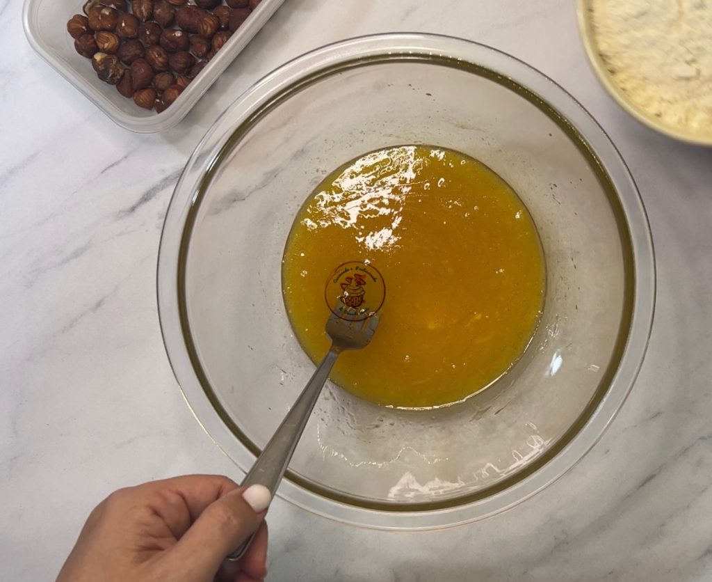 Em uma tigela, colocamos o óleo, o mel, o ovo e a baunilha e misturamos com um garfo.