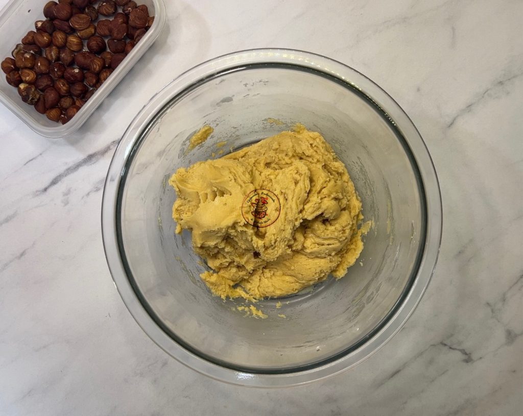 Untamos as mãos e modelamos os biscoitos. Como pequenas bolinhas, disponha os biscoitos na assadeira forrada com papel manteiga. No centro de cada biscoito coloque uma avelã e asse a 180°C por cerca de 20 minutos.
