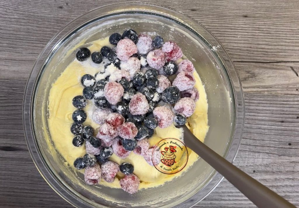 Coloque o batedor de lado e use a espátula de silicone. Enfarinhe levemente as frutas vermelhas e adicione-as à massa. Misture bem.