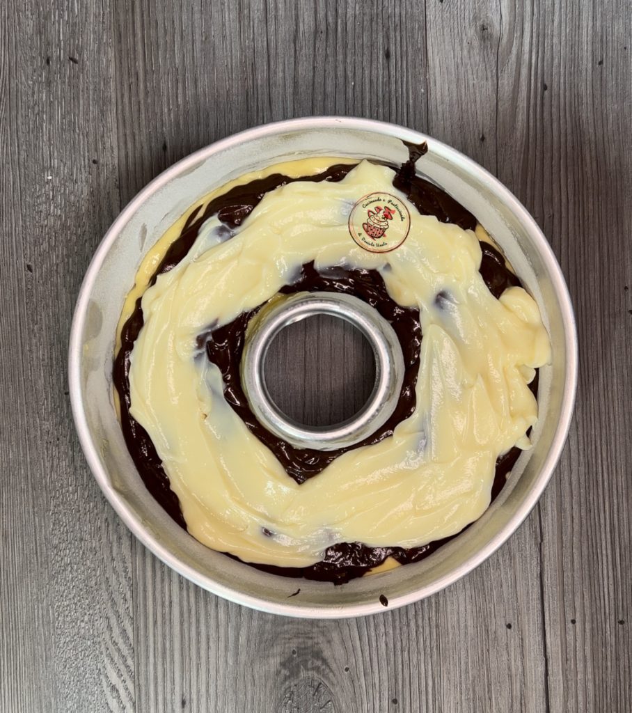 Adicione o cacau e o leite restante à massa de maçã e incorpore à massa branca.