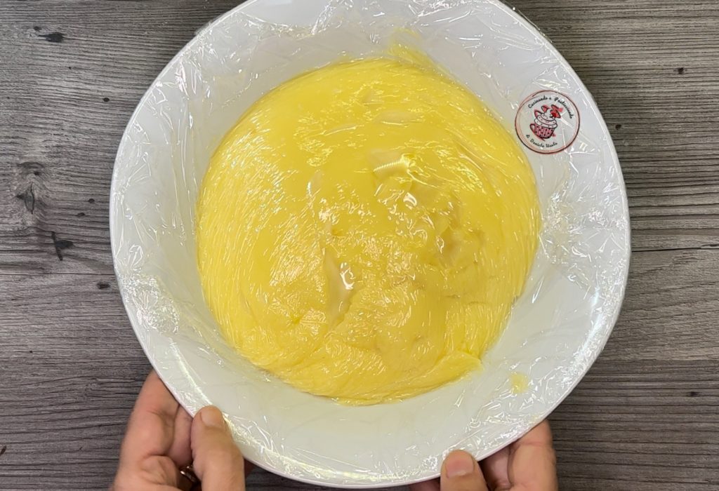 Prepare o Creme Bimby de Baunilha conforme a receita e deixe esfriar coberto com filme plástico em contato.