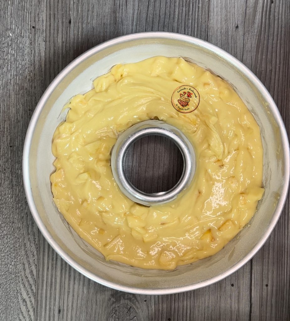 Adicione o óleo, o leite, a farinha, a baunilha e o fermento e misture bem para dissolver todos os grumos. Por último, 2 maçãs cortadas em cubos.