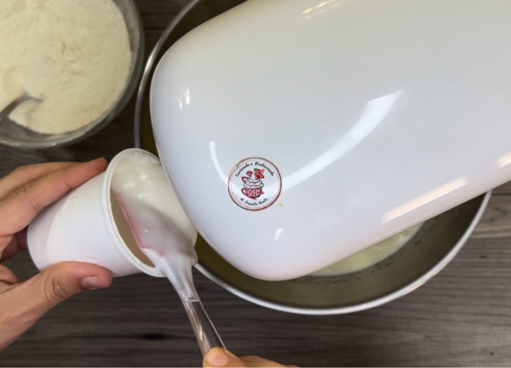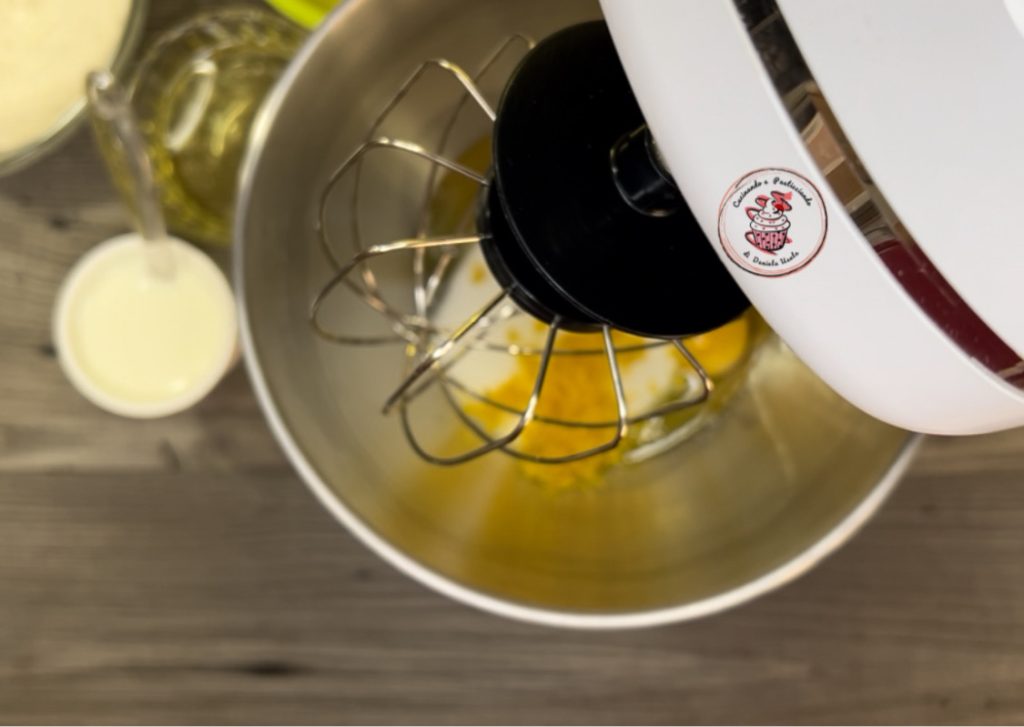 • Adicione o óleo, o iogurte e o suco de limão. Continue batendo.