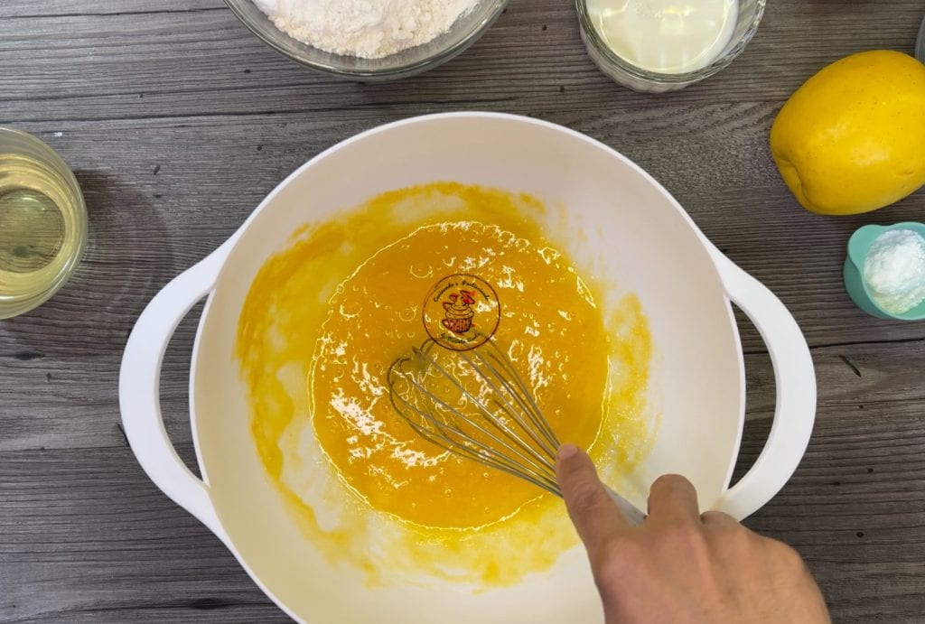 Despeje o açúcar e os ovos em uma tigela e misture. Enquanto isso, coloque as uvas passas de molho.