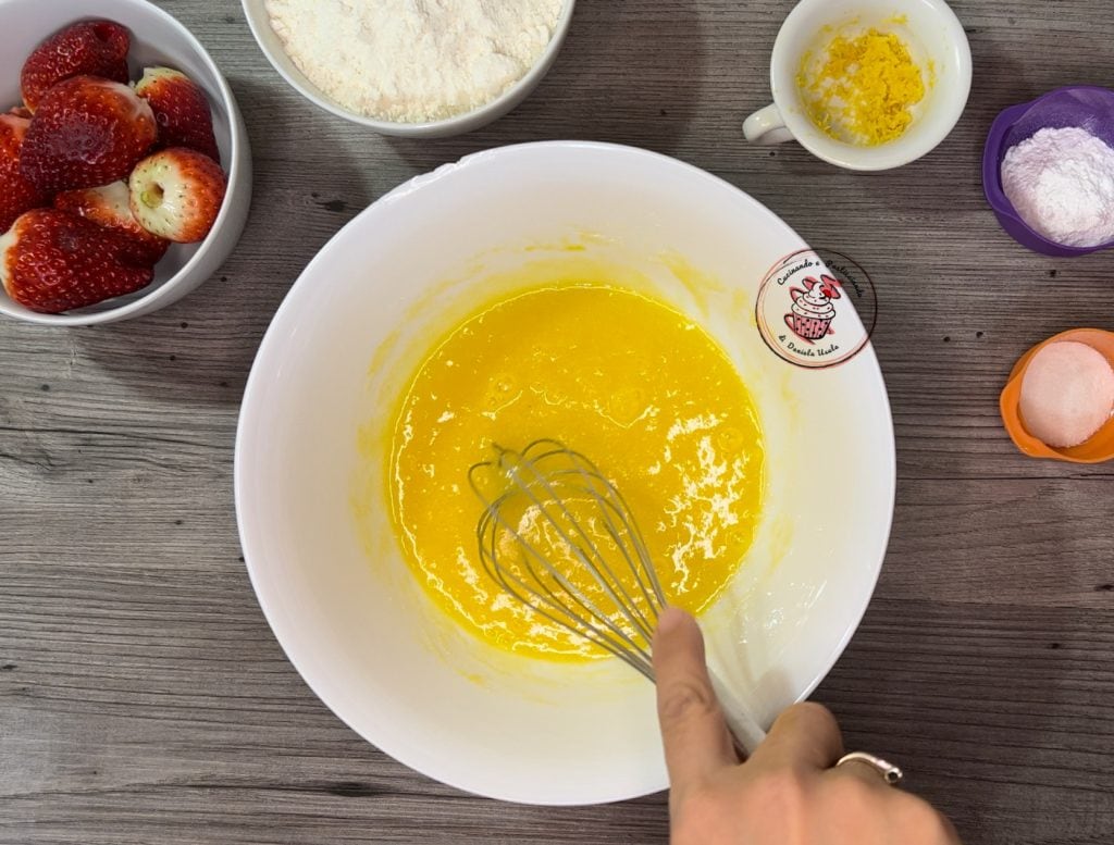 Em uma tigela, coloque os ovos e o açúcar e misture com o batedor manual por alguns minutos.