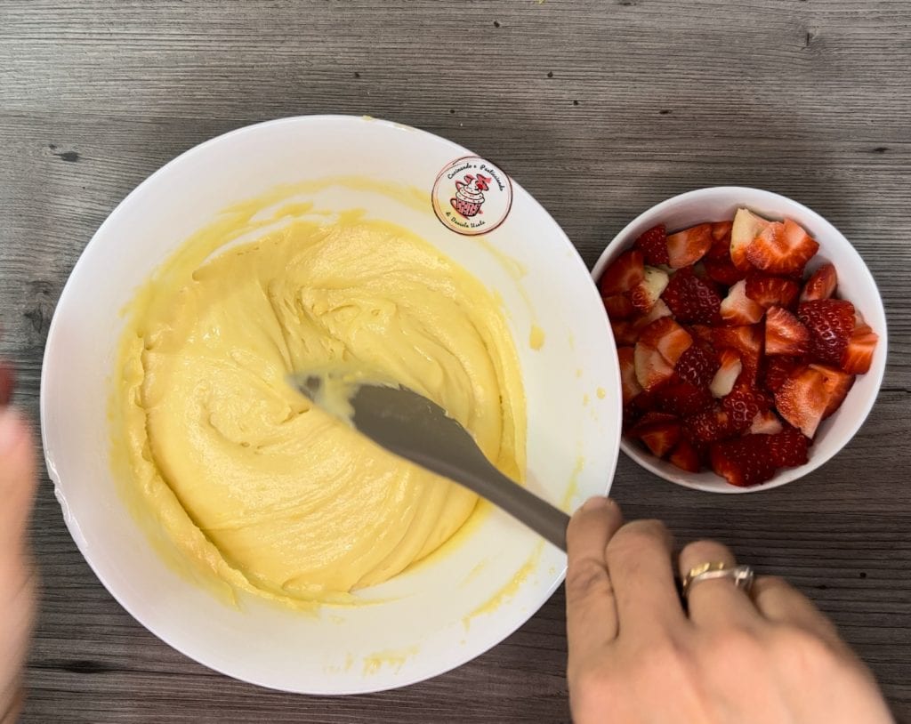 Adicione colheradas de creme de confeiteiro e os morangos cortados ao meio. E asse por cerca de 45 minutos a 180°.