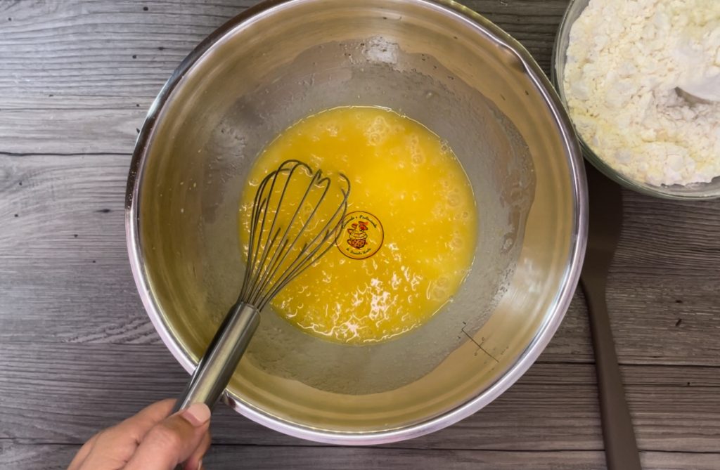 Em uma tigela grande coloque 80 ml de leite, 80 ml de óleo, a casca de 1 limão, 150 g de açúcar e os 2 ovos. Misture com o batedor de mão por alguns minutos.
