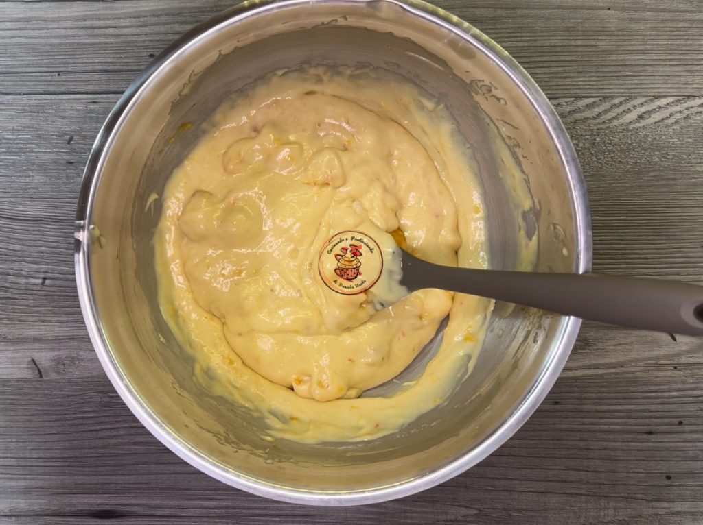 Adicione 2 pêssegos, lavados e sem casca, cortados em cubos à massa e misture novamente.