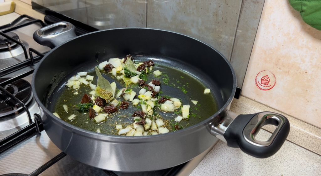 • Na caçarola adicione o óleo e acrescente o tomate seco, 2 cabeças de alho e um punhado de salsa picada. Em seguida, adicione o louro e todas as especiarias, deixando dourar por 5 minutos.
