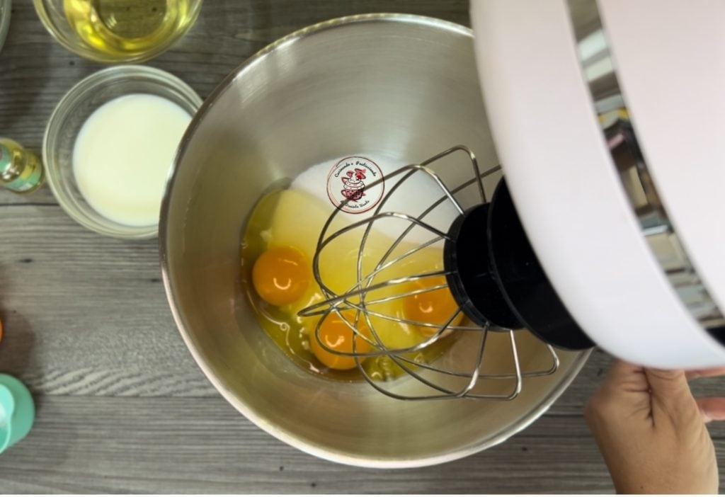 Bata os ovos com o açúcar na batedeira planetária por cerca de 10 minutos.