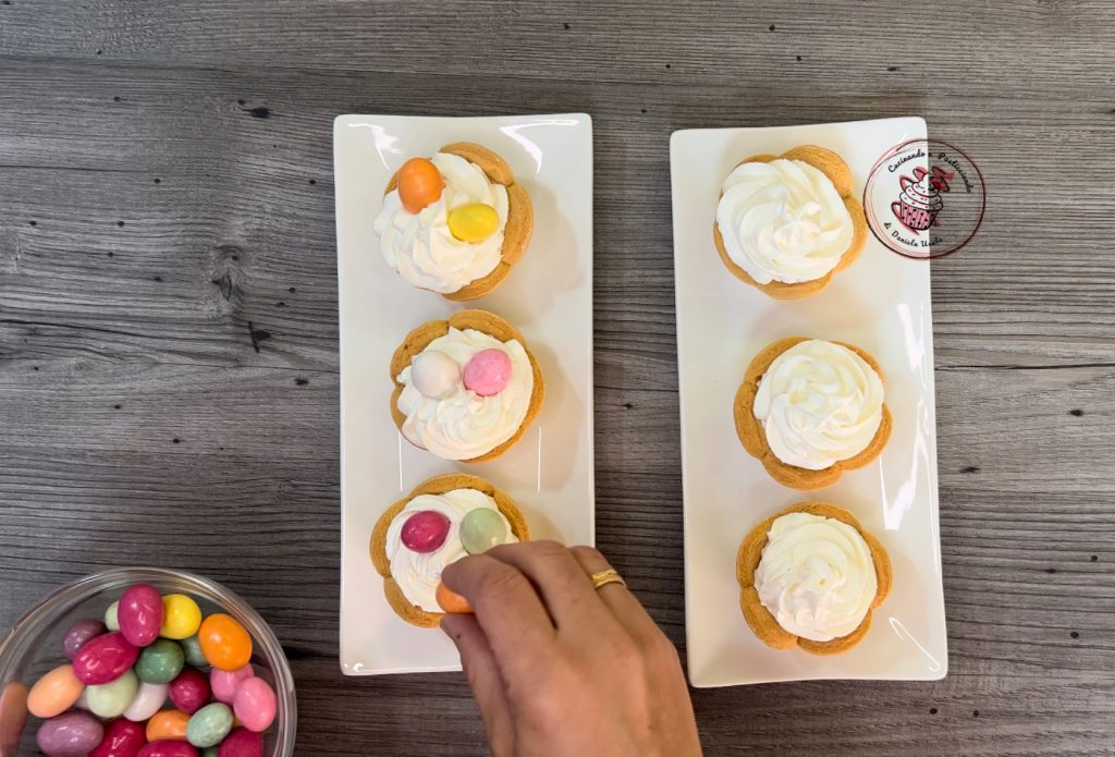Quando as cestinhas estiverem frias, recheie com o creme de ricota e decore com os ovos coloridos, e deixe na geladeira até o momento de servir.