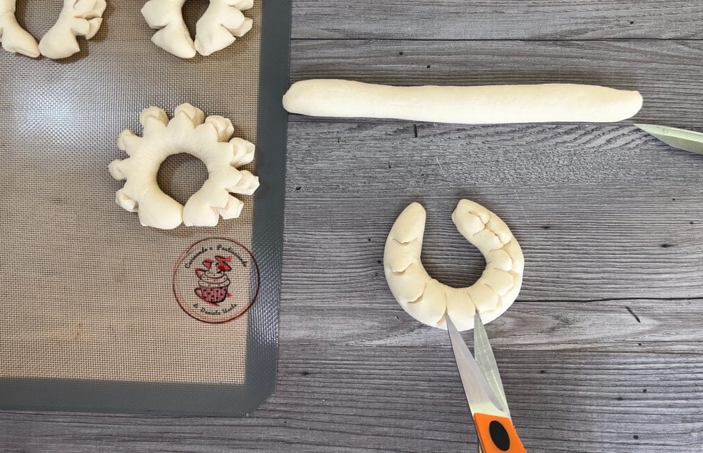 Transferi novamente a massa para a bancada e com faca e tesoura formei o Coccoi.