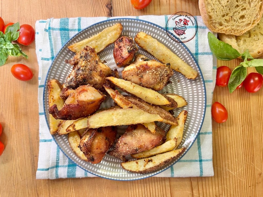 Coloque os pedaços de coelho no cesto da fritadeira, adicione as batatas cortadas em gomos e passadas também na farinha de rosca e adicione um pouco de óleo. (Eu uso o borrifador de óleo que é muito prático). Cozinhe por cerca de 20 minutos a 200°.
