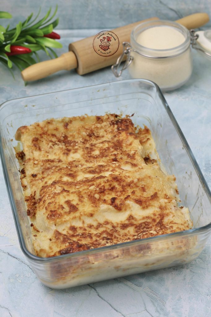 • Coloque as crepes recheadas em uma assadeira com uma base de bechamel.