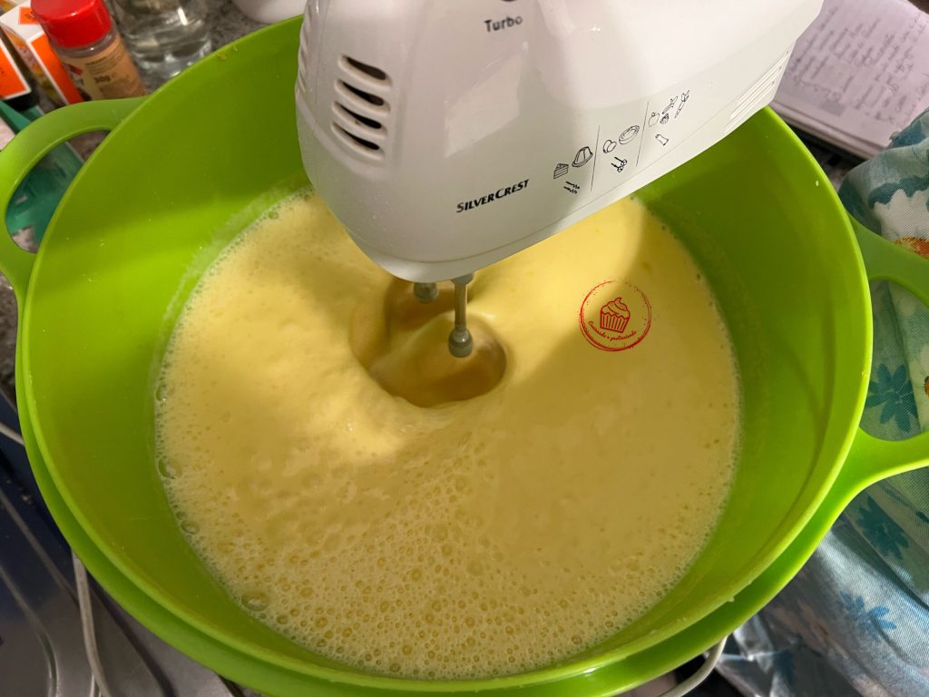 • Bater com as batedeiras elétricas os ovos com o açúcar por pelo menos 20 minutos, deve resultar em um composto espumoso e bem volumoso.