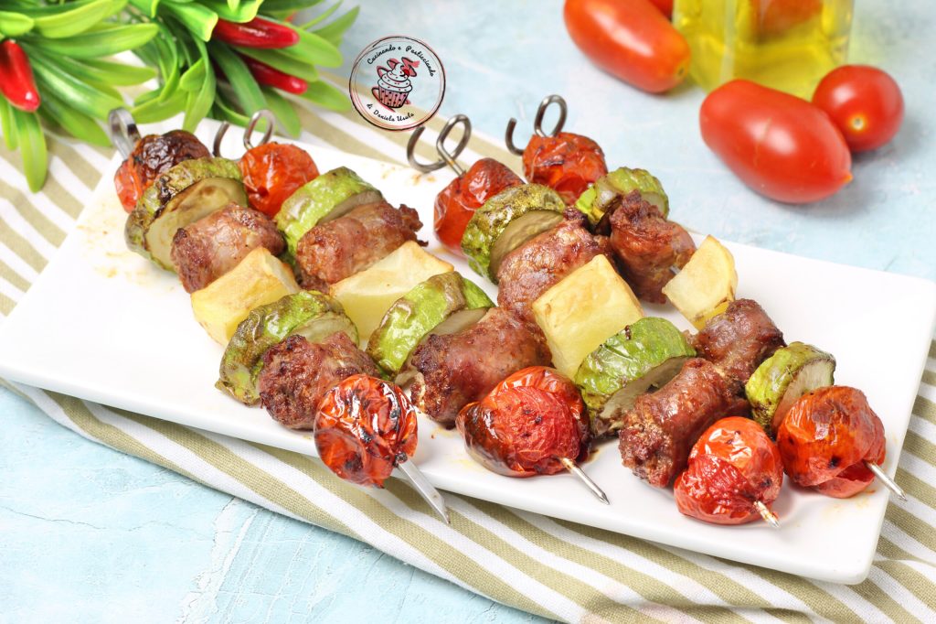 Hoje, almoço super rápido!!! Adoro espetinhos, acho eles práticos e, além disso, todo mundo sempre gosta muito. Hoje preparei-os de forma bem simples, e para economizar tempo e esforço, usei a fritadeira a ar. Agora eu a uso praticamente todos os dias. Para os espetinhos, usei linguiça e alguns legumes que tinha na geladeira. Mas você pode usar frango ou a carne que preferir. Veja quantas ideias você pode ter com espetinhos.