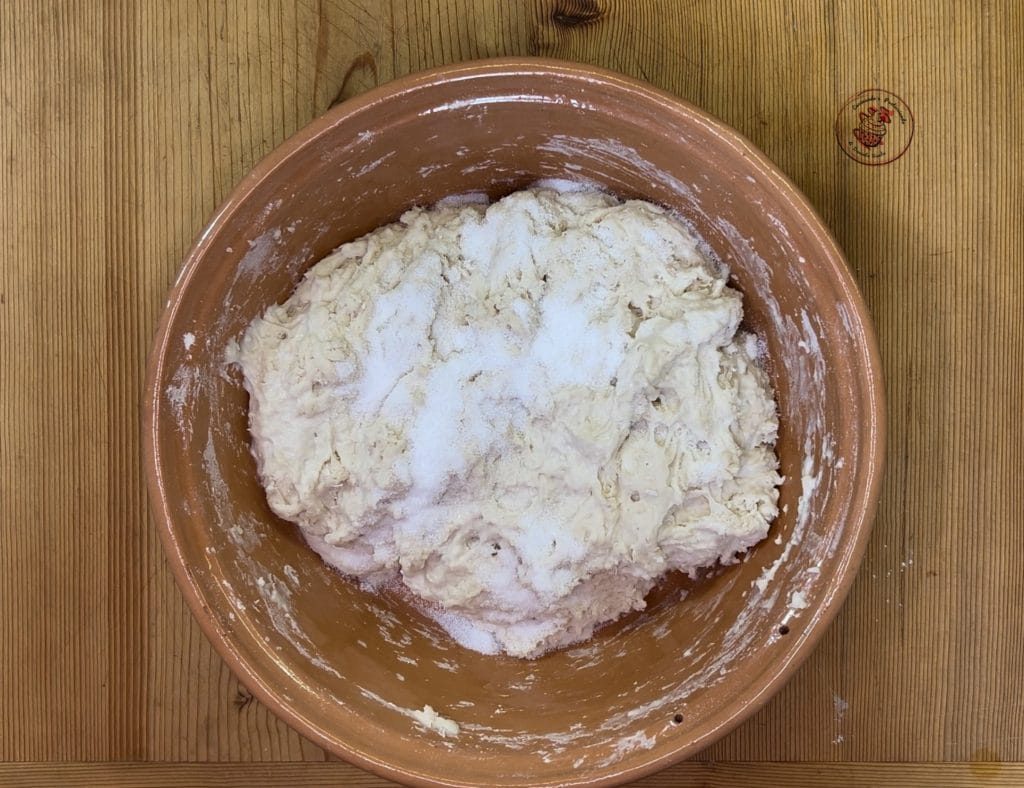 Adicione o sal e sove até a massa absorver todo o sal. Neste ponto, faça 3 voltas de dobras em intervalos de 15 minutos uma da outra.