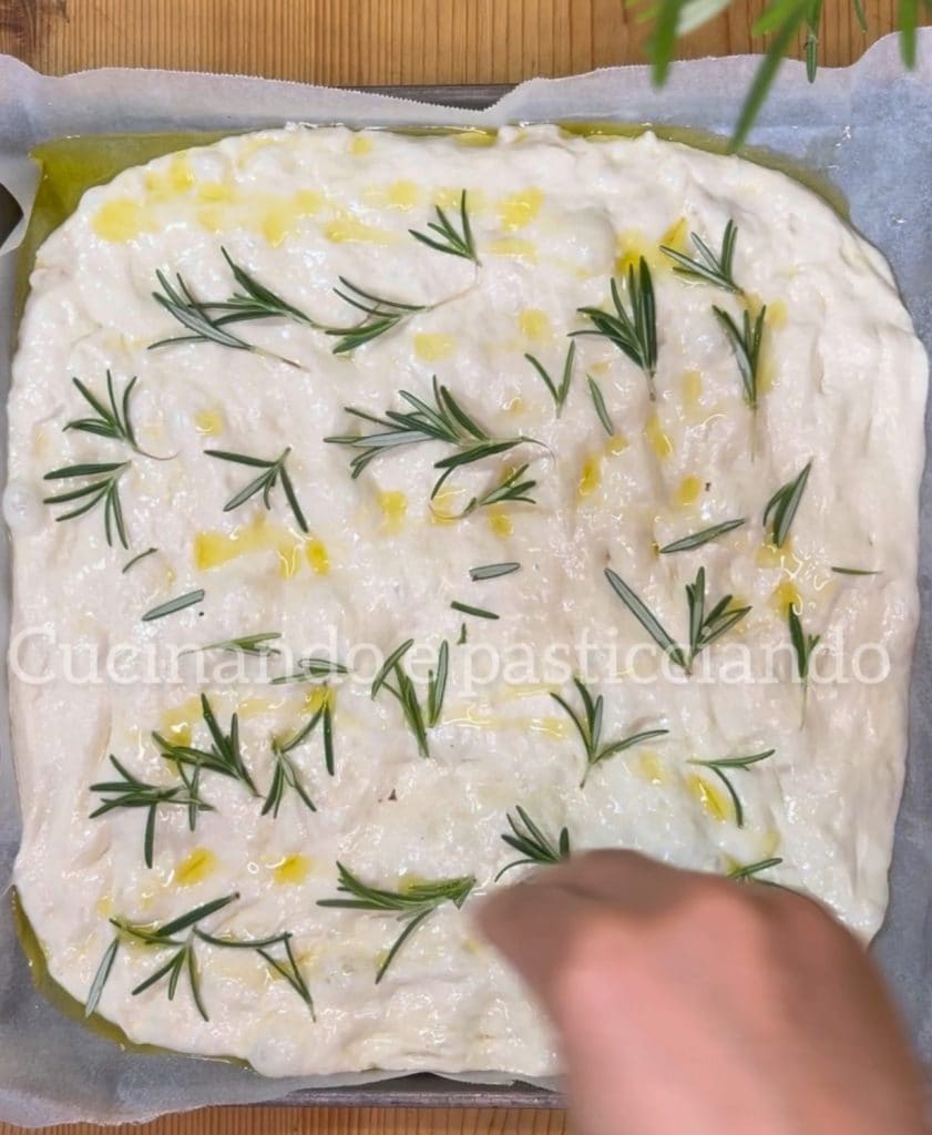 Após a levedura, estenda a focaccia com as mãos untadas com óleo. Adicione óleo e sal grosso na superfície e, se desejar, bastante alecrim.