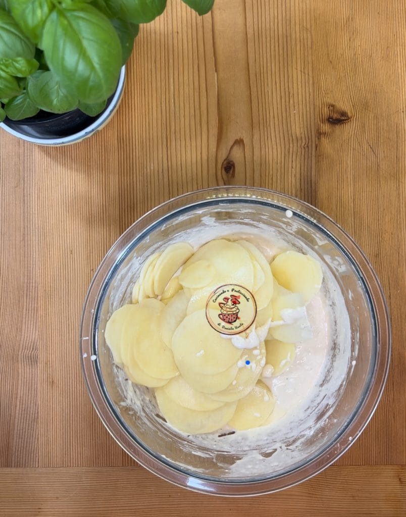 • Adicione as batatas cortadas bem fininhas e escorra com cuidado.