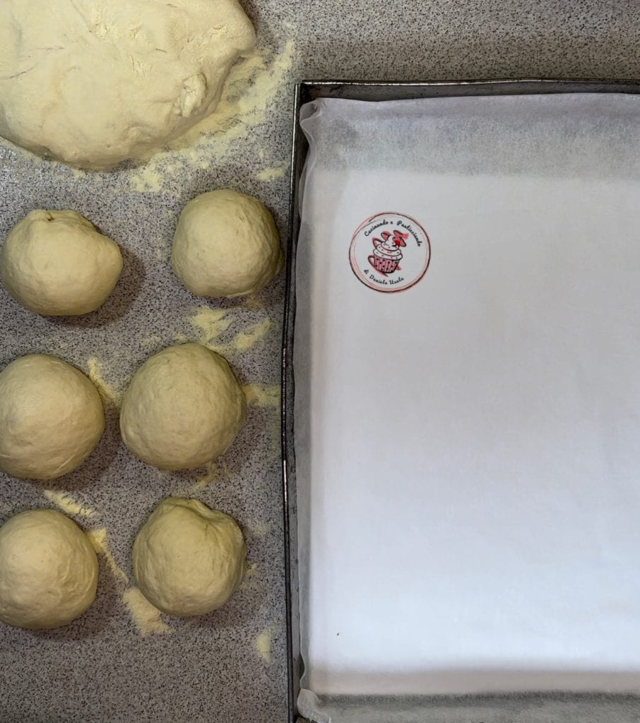 Transferir a massa para uma superfície enfarinhada e dividir em pedaços de cerca de 100 g formando bolinhas.