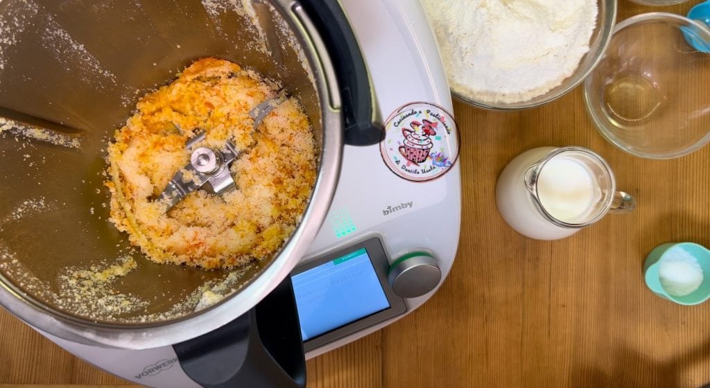 Coloque no copo o açúcar, as raspas de limão e de laranja, pulverize por 30 segundos na velocidade 9. Reúna no fundo com a espátula.