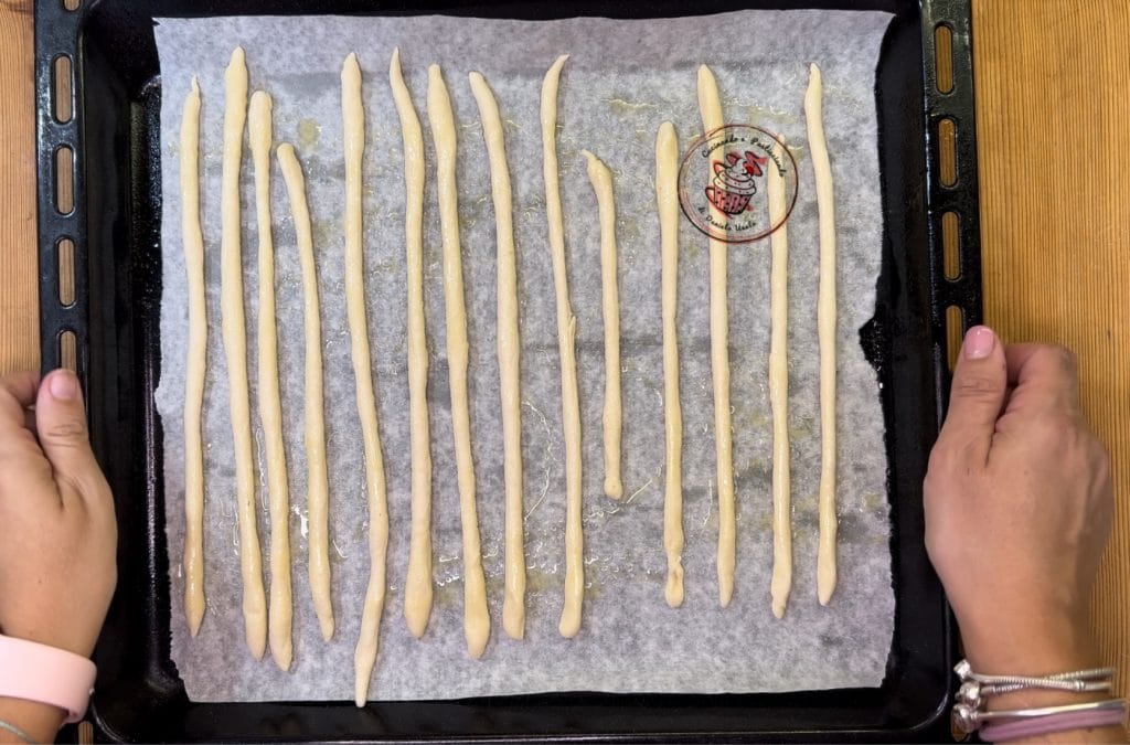 Dessas pequenas partes de massa, forme os grissini. Role-os com as mãos.