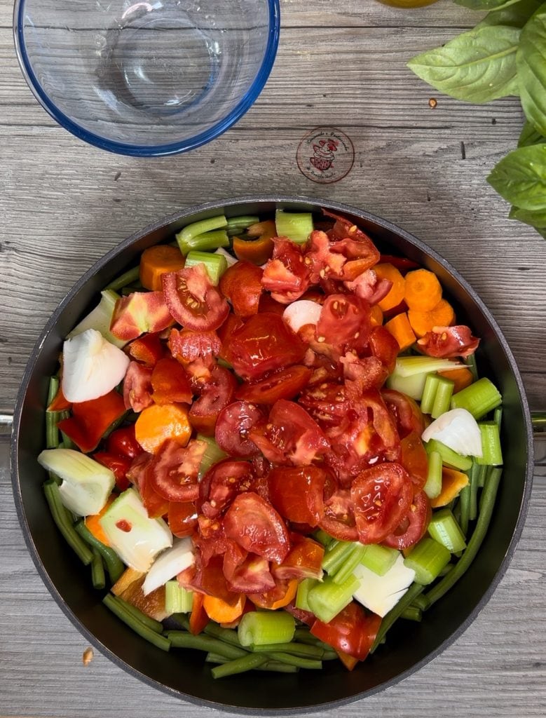 Lave e corte todos os legumes em pedaços dentro da frigideira.