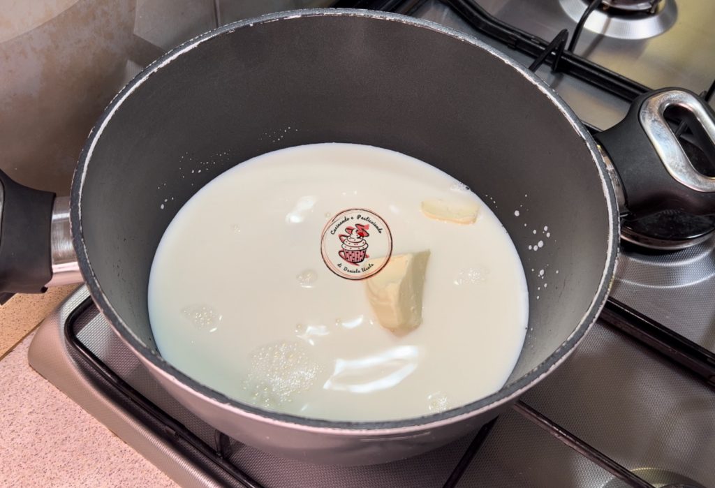 Coloquei o leite para aquecer em uma panela com a manteiga, o sal e o açúcar.
