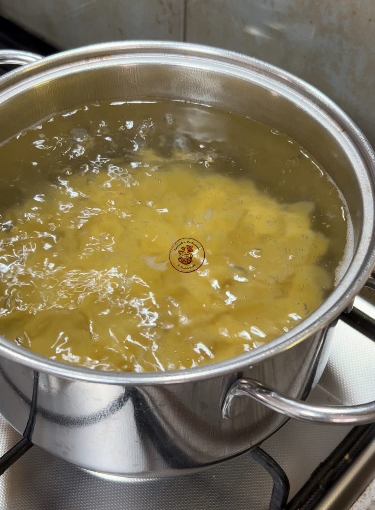 Enquanto isso, cozinhe a massa em água salgada abundante pelo tempo indicado na embalagem.