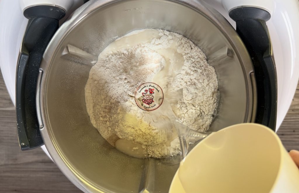 • No copo do Bimby, despeje a farinha, o fermento e 340 gramas de água. Amasse por 2 minutos na velocidade espiga.