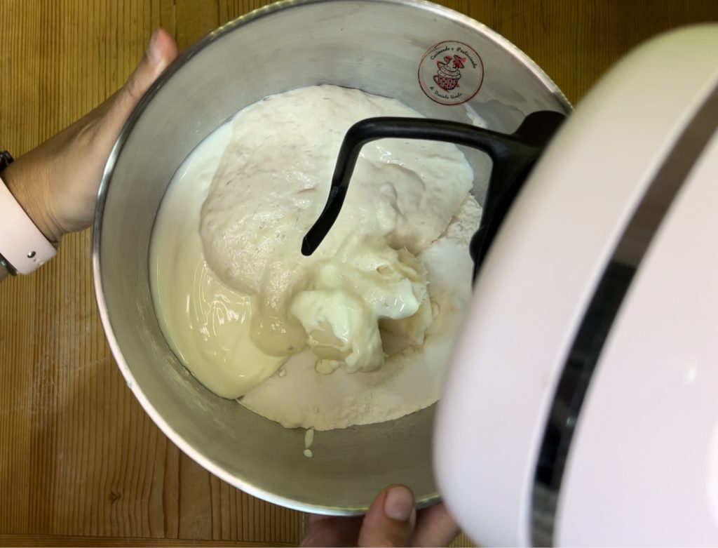 Na tigela da batedeira adicione a farinha, o açúcar, a vanilina, o sal, a banha, o iogurte e o fermento natural.