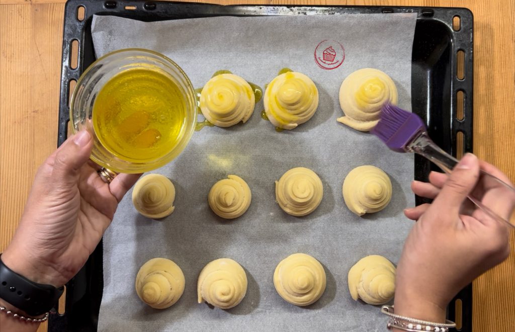 Deixei crescer na assadeira até duplicar, depois pincelei com uma salmoura de água, óleo e sal e assei a 200ºC por cerca de 20 minutos.