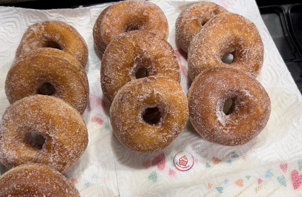 • Fritei em óleo quente, passei em papel absorvente e finalmente no açúcar refinado.