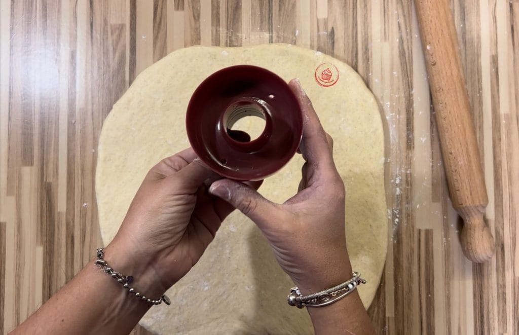 • Com o molde para rosquinhas apropriado, recortei as rosquinhas que deixei crescer por cerca de uma hora, até dobrar de volume.