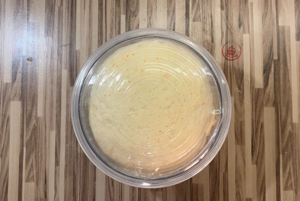 Após 30 minutos, peguei a massa novamente, trabalhei por alguns segundos e formei uma bola lisa e homogênea. Coloquei para crescer em uma tigelaa coberta com filme plástico, no forno desligado e levemente aquecido até dobrar de tamanho. Isso levará cerca de 3 horas.