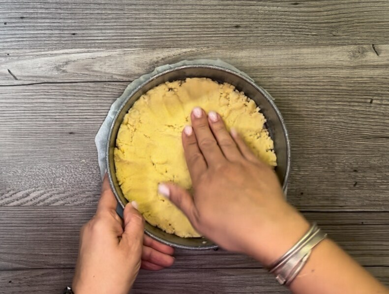 • Transfira 1/3 da mistura para o fundo da forma. No fundo da forma recomendo um papel manteiga, será mais fácil depois retirar da forma.