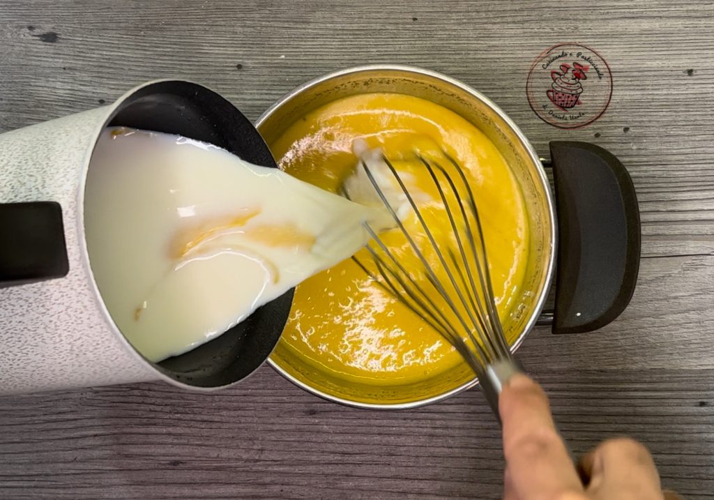 • Adicionamos o leite quente e, mexendo, levamos ao fogo.