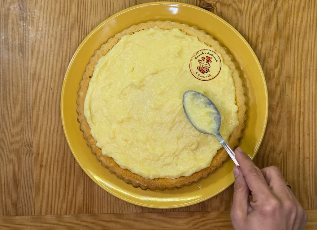 • Quando a base está assada, viramos em um prato de servir e deixamos esfriar. Uma vez fria, molhe a superfície com suco de fruta (eu usei o suco da fruta em calda que usei para a decoração). Adicione o creme de confeiteiro frio e frutas frescas a gosto.