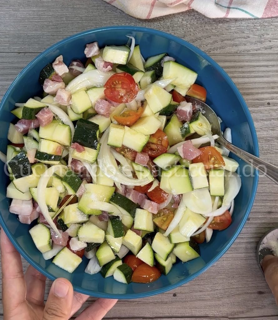 Adicionar o bacon e a cebola fatiada fina.
