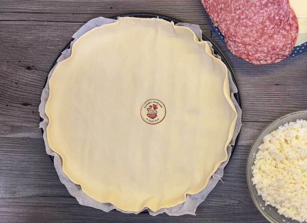 Dispor sobre o disco de massa folhada o salame, o queijo, os pimentões e a mozzarella.
