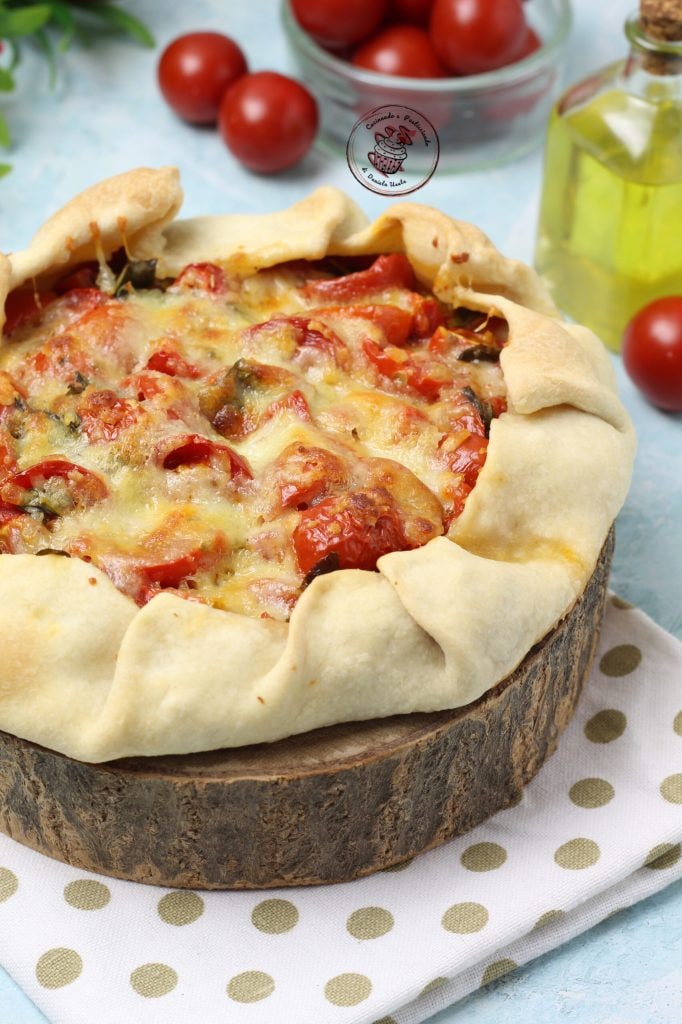 Vocês sabem que adoro tortas salgadas, e ainda mais os tomates. Então por que não unir essas duas paixões minhas? Hoje preparei a torta salgada com tomates. Muito boa, suculenta e com bastante manjericão e mussarela. Realmente deliciosa. Eu fiz em casa também a base, mas vocês podem tranquilamente usar um disco de massa folhada. Mas acreditem, a base feita em casa tem um sabor totalmente diferente. Experimentem. Aqui também há outras ideias para tortas salgadas realmente saborosas.