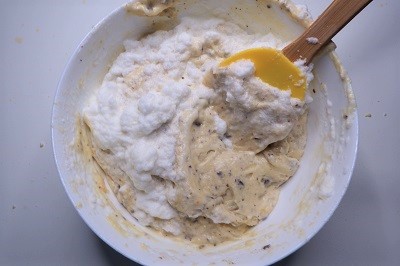 • À parte, bata as claras em neve com uma pitada de sal. Adicione-as aos poucos à massa do bolo, com movimentos de baixo para cima usando a espátula