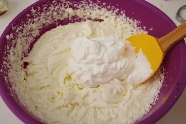 Despeje no composto de mascarpone a gelatina recém-preparada e misture cuidadosamente. Adicione depois uma colher de creme de leite batido de cada vez e misture ao composto com movimentos da espátula de baixo para cima.