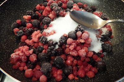 Deixe a gelatina de molho em água fria por 10 minutos. Despeje na panela as frutas vermelhas com o açúcar e o suco de limão, cozinhe até que fiquem macias e que se forme um caldinho no fundo da assadeira. Apague o fogo, adicione a gelatina previamente espremida com as mãos e misture até que esteja completamente dissolvida. Deixe esfriar.